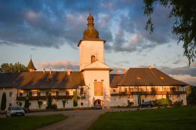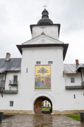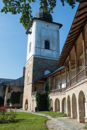 Intrarea in incinta manastirii se face prin gangul clopotnitei, care are o poarta mare din lemn masiv, datand din anul 1769. Clopotnita manastirii a fost construita in trei etape: prima etapa, parterul, de la Alexandru cel Bun (1407); dupa 1540 etajul, iar intre anii 1819 – 1821 spatiul superior al clopotelor.